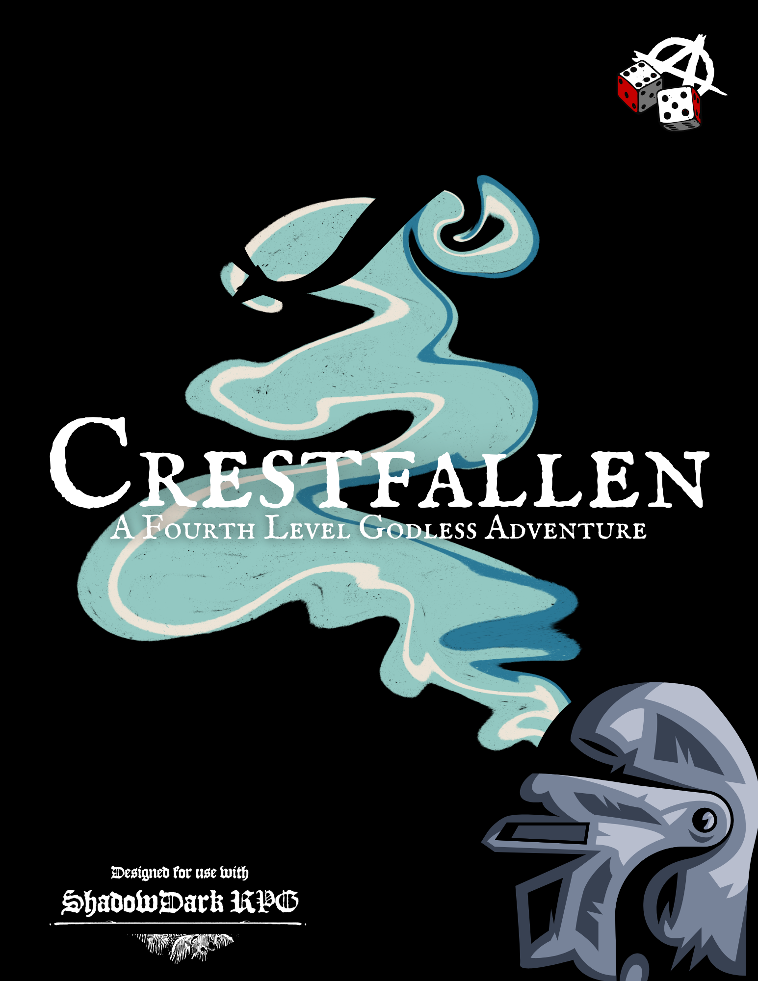 CRESTFALLEN is a level 4 adventure for Shadowdark RPG set within the larger world of GODLESS, meant to bring players from level 4 to level 7. This 16 page adventure booklet includes a starter dungeon, the trappings of the mountain fortress and its inhabitants, and the necessary components for a large-scale battle.